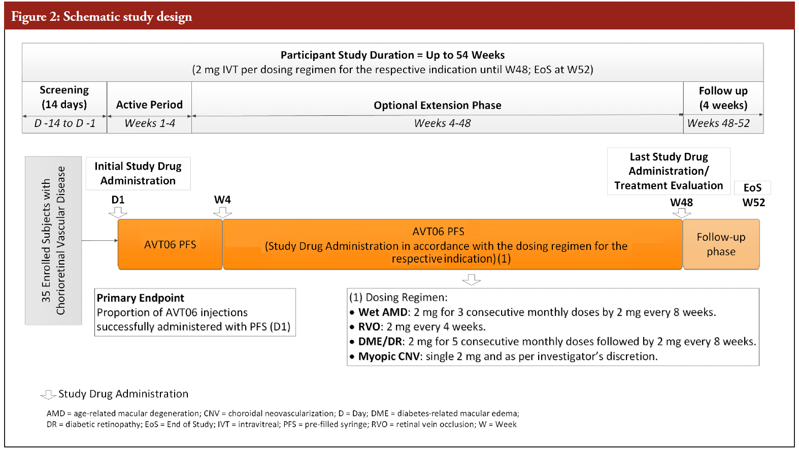 The clinical trial reported in this article aimed to demonstrate intended and safe handling of AVT06 PFS, by evaluating the proportion of successful injections of AVT06 after a single administration with PFS. The secondary objective of the study was to evaluate ocular safety after a single dose of AVT06 delivered with PFS. The Optional Extension Phase provided the participants with continuous treatment with AVT06 to collect additional long-term safety data of the AVT06 delivered from the PFS. This study was conducted to support licensing of AVT06 PFS presentation and was part of a submission to regulatory authorities, together with a confirmatory efficacy and safety study demonstrating comparative efficacy and safety between AVT06 in vial presentation and Eylea© in patients with nAMD [8].